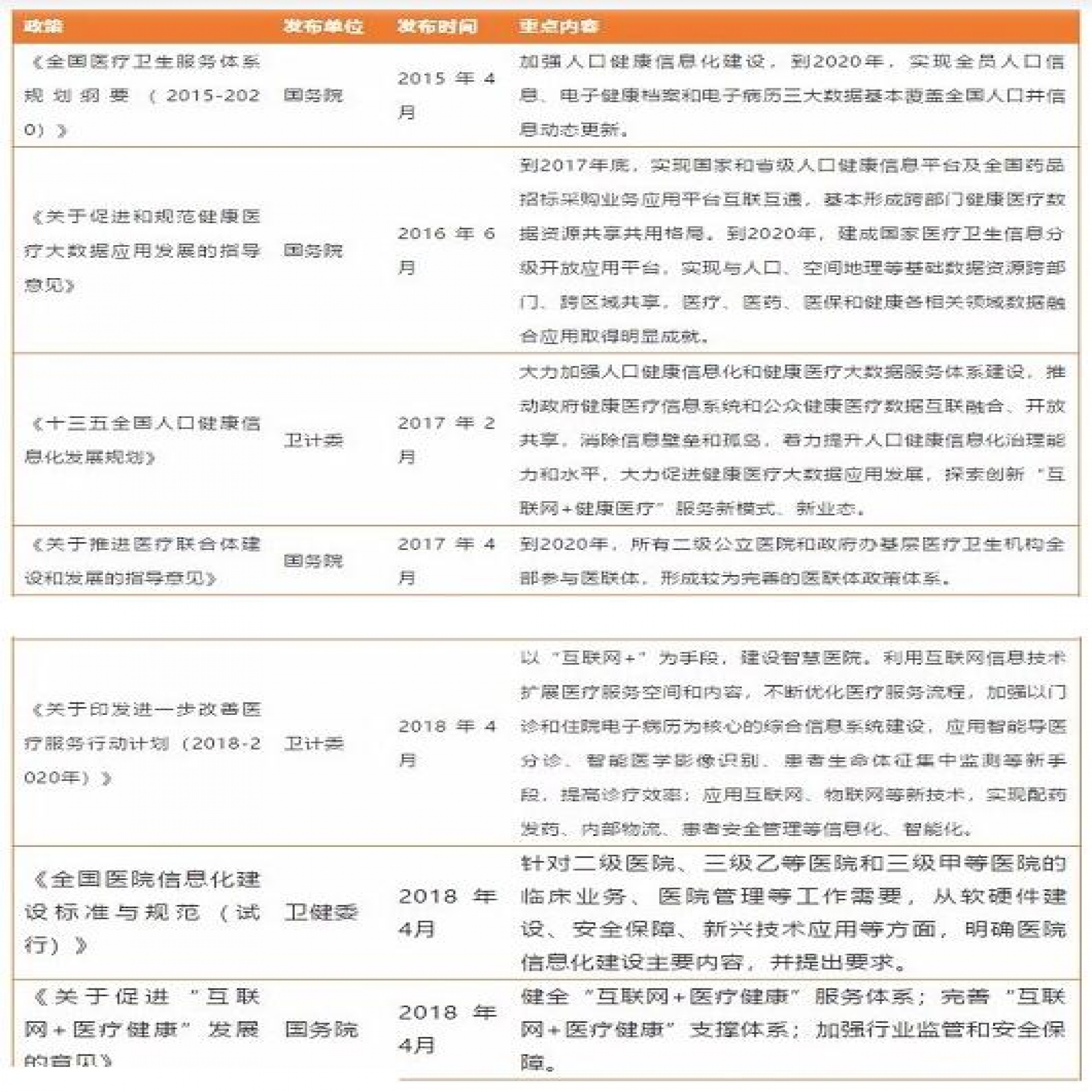 事實(shí)上,自2015年4月,國(guó)務(wù)院發(fā)布《全國(guó)醫(yī)療衛(wèi)生服務(wù)體系規(guī)劃綱要(2015-2020)》,提出加強(qiáng)人口健康信息化建設(shè),到2020年,實(shí)現(xiàn)全員人口信息、電子健康檔案和電子病歷三大數(shù)據(jù)基本覆蓋全國(guó)人口并信息動(dòng)態(tài)更新,我國(guó)陸續(xù)出臺(tái)了一系列加速醫(yī)療信息化產(chǎn)業(yè)發(fā)展的政策。