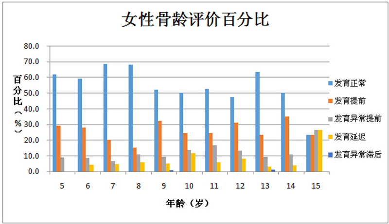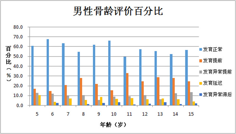 而骨齡是一項與兒童身高發育相關的數據。提前或者滯后發育都可能導致孩子不能正常分泌生長激素。《報告》中有關骨齡顯示:男生的最高異常率為47.6%,出現在14歲;女生最高異常率為47.5%,出現在11歲。在發育異常的現象中,發育提前的比例要高于發育延遲。男生提前發育(發育提前+發育異常提前)比例在各年齡段均超過了25%,最高異常率為42.1%,出現在11歲;滯后發育(發育延遲+異常滯后)的最高比例為10.9%,出現在9歲。女生提前發育(發育提前+發育異常提前)比例在各年齡段也均超過了25%,最高異常率為50%,出現在15歲;滯后發育(發育延遲+異常滯后)的最高比例為11.9%,出現在10歲。